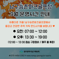!!남구승촌파크골프장 9월 운영시간 안내!!아름다운 가을! 남구승촌파크골프장에서 즐겁고 건강한 추억 가득 만드시기를 바랍니다.자세한 사항은 누리집 또는 카카오톡 채널 "남...